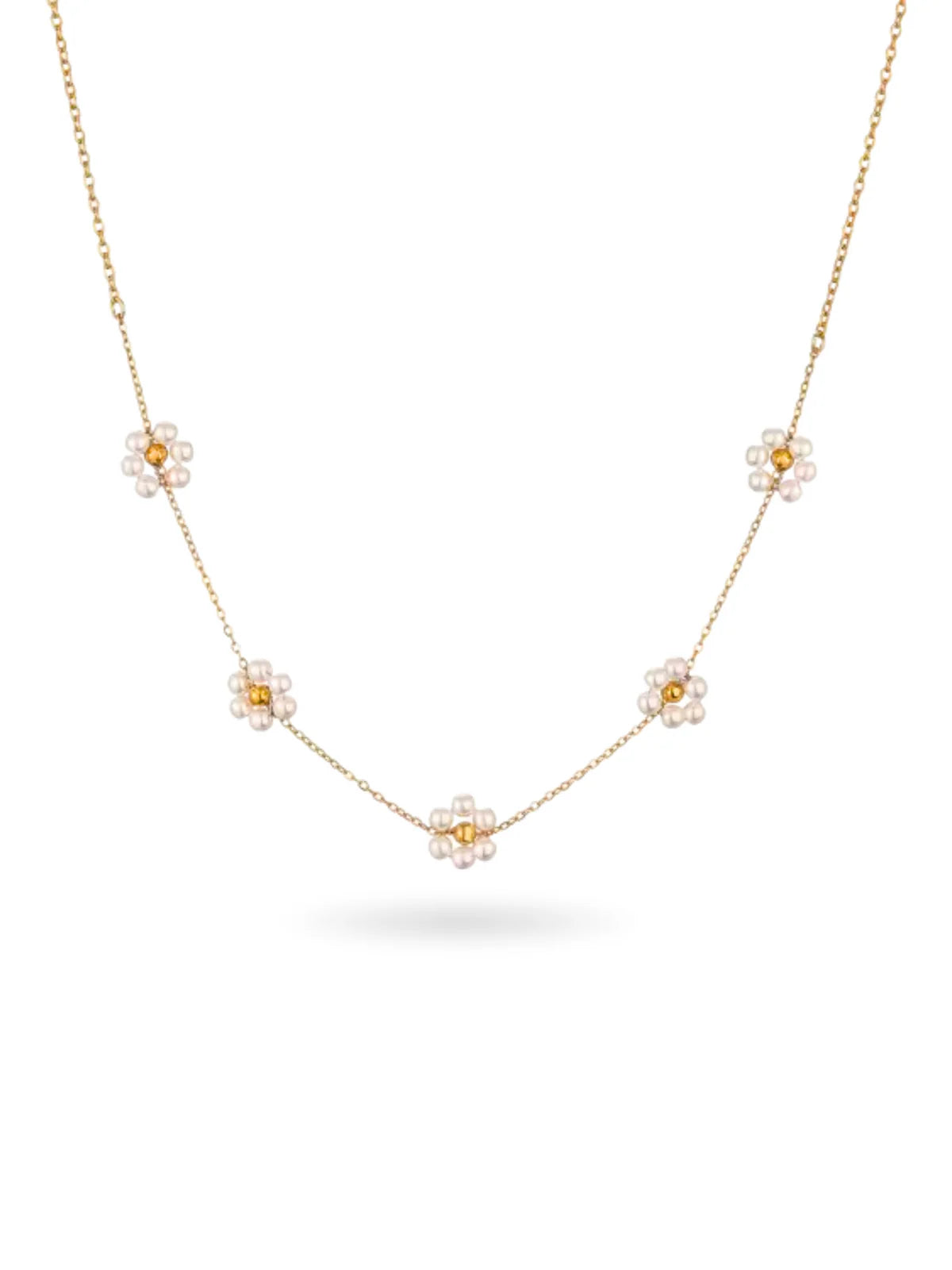 Un jardín de delicadeza alrededor de tu cuello. Este encantador collar, elaborado en acero inoxidable enchapado en oro de 18K, está adornado con margaritas blancas que recorren toda su cadena, creando un efecto fresco, romántico y lleno de luz. Perfecto para quienes aman los diseños femeninos y con espíritu natural.