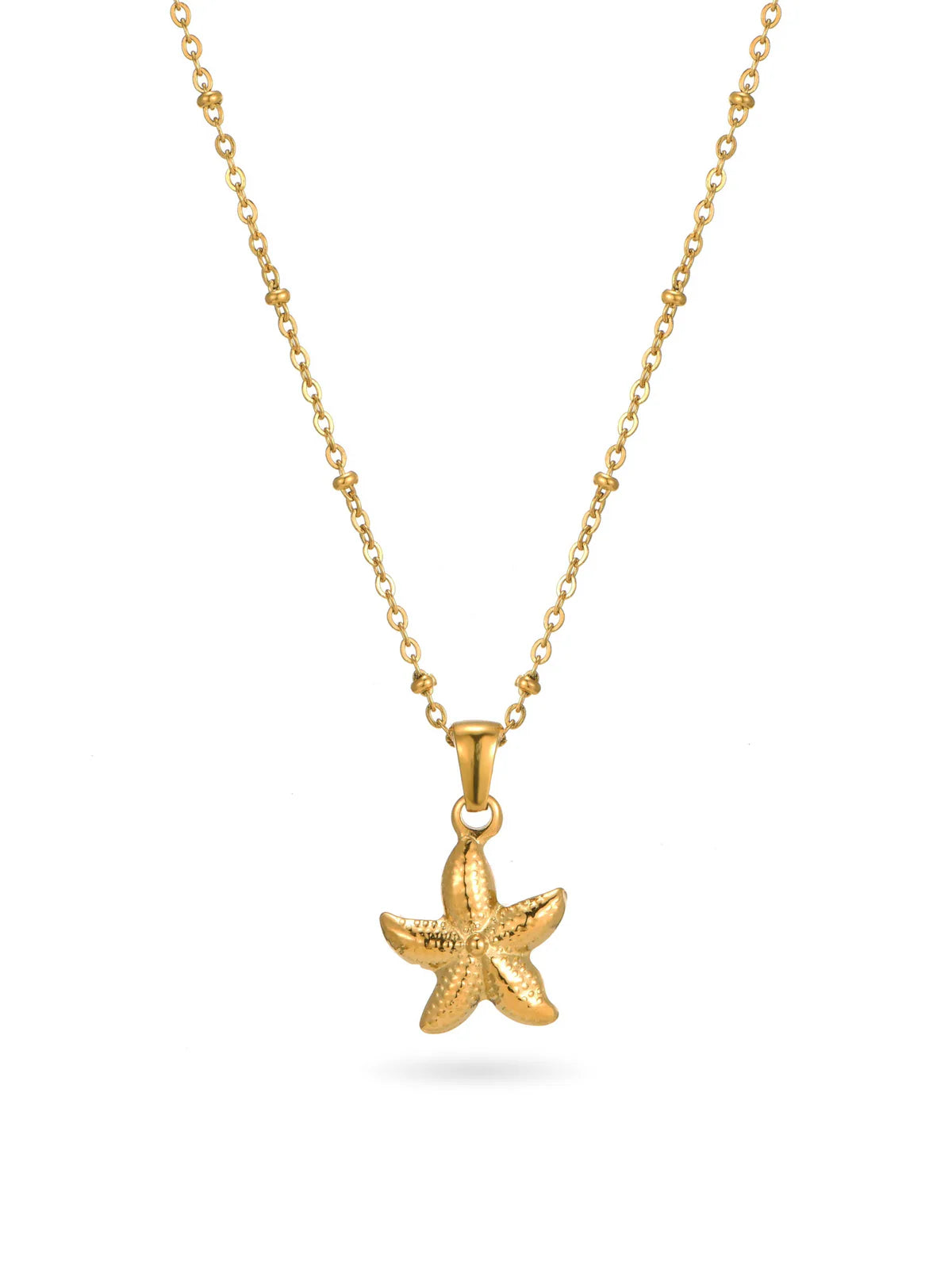 La magia del océano en un diseño redondeado. Este collar, elaborado en acero inoxidable con enchape de oro 18K, presenta un dije de estrella de mar con forma "bombita" (redondeada y voluminosa), capturando la esencia juguetona del mar con un toque de elegancia. Ideal para amantes de la vida marina y los diseños únicos.