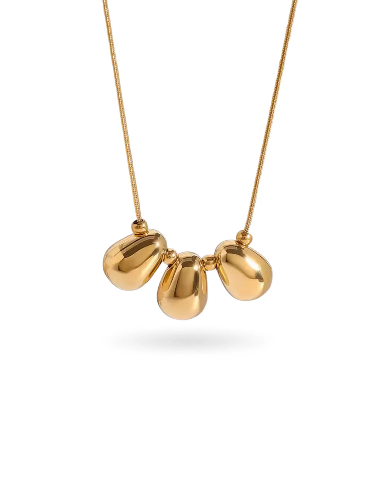 Fluidez y movimiento en triple armonía. Este collar, elaborado en acero inoxidable con enchape en oro de 18K, presenta tres dijes en forma de gotas de agua, evocando la elegancia serena de la lluvia y la pureza del agua en movimiento. Un diseño que captura la esencia de la naturaleza con un toque de sofisticación moderna.
