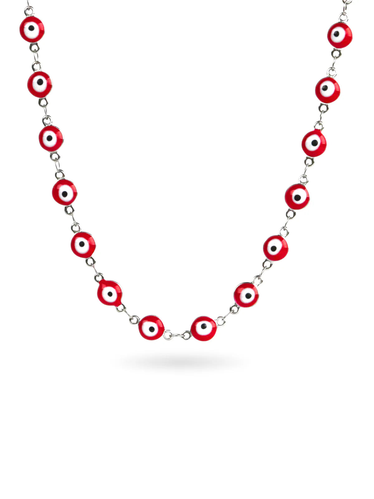 Esta gargantilla está completamente adornada con ojos turcos en tonos rojos intensos, creando un collar llamativo y cargado de simbolismo. Los amuletos, distribuidos en patrones simétricos, irradian energía y estilo.